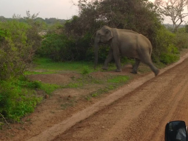 In this way, when we were still about 2 miles from the park, we saw the following go past us along the road: scenery scenery scenery big bushes scenery bushes elephant scenery scenery scenery. It was such a strange surreal moment for my brain. This huge thing just standing there, hidden until the moment you actually passed it. Janaka slammed on the breaks and backed up, and after a few hesitant moments it crossed the road right in front of us.